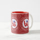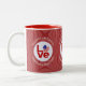 Personalised two tone coffee mug with design on three sides features red letters read LOVE, with a heart shaped flag of the United States of America for the O. It sits in the centre of a white circle of squiggly squares. A red background, also of squiggly squares, sets the tone for Valentine's Day. Above, in white letters, is a place for a name or family name. Below, it reads VALENTINE'S DAY 20??. You personalise by adding the appropriate number for the year. You can also change the words from Valentine's Day to meet any occasion.
