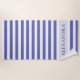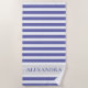 Chic cabana stripe beach towel with Very peri (blue violet shade) and white striped pattern. Light grey band with your name.