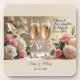 dd a touch of romance to your tabletops with this elegant hard plastic coaster, featuring a beautiful design of champagne flutes tied with satin bows, surrounded by roses, lilies, and hydrangeas. The words “Cheers to Love, Laughter & Happily Ever After” are delicately scripted, making this coaster a perfect accent for weddings, bridal showers, engagement parties, or anniversary celebrations.