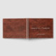 A simple elegant couple's wedding name monogram with date and location, on a brown coloured faux leather effect background. Simple classic elegance. Wedding guest signing keepsake book. Elegant ancient serif type modelled on Roman engraving style, with script ampersand.