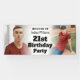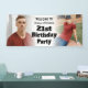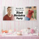Modern 21st birthday party welcome sign for men. Personalised banner with a modern 2-photo collage and bold letters. For inside or outside use. To change the photo placement: click on the button to customise the design, click on "crop", and move the image to centre it.
