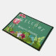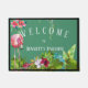 Tropical fantasy of flowers, foliage, and flamingo in watercolors against abundant green background. Customise your welcome. Primarily warm pinks and tropical greens.