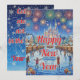 Send a magical wish with this artistic holiday card depicting a snowy town celebration under a sky of colourful fireworks. A nostalgic and heartwarming choice for the New Year