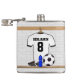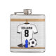 Personalised white and black football soccer jersey shirt, hanging in a sports locker room with a water bottle, football cleats and a soccer ball. Just add the name and number (or age) of the soccer player, football fan or soccer team coach to create a unique soccer gift.