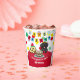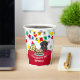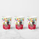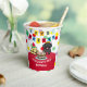 Personalised Yellow and Black Labradors Birthday Paper Cups for dog lovers. Whimsy and funny Labrador Retriever Cartoon created by Naomi Ochiai from Japan. Two Labrador puppies are celebrating their birthday!! Yellow Labrador Puppy and Black Labrador Puppy are sitting at the Red Table in the colourful polka dot background.