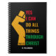 Striking personalised Christian Notebook with half power fist and YES I CAN DO ALL THINGS THROUGH CHRIST which is based on Philippians 4:13. The wording is in bold red, gold and green typography, and at the bottom there is a CUSTOMIZABLE sample name, where you can add your name or alternative text. This Christian Notebook can be used as a prayer journal, devotional diary or goal-setting notebook and would make a great gift all year round, and especially during Black History Month season.