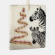 This holiday Christmas tree ornament features two wild zebras with winding ribbon and stars Christmas trees.