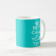 Personalizable Keep Calm Mug with custom colours like turquoise, red or pink. Create your own funny Keep Calm and Carry On parody. Simply edit the text of this template to make a unique design. Popular examples are: Keep calm and party on. Keep calm and love me. Keep calm and drink tea. Personalised mugs are a great gift idea for friends and family.