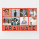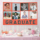 personalized graduation banner with 8 class graduate photos and the word graduate written in bold black and white in the classic and traditional university typography on a red background for a bold party banner.