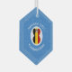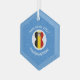 An angel dressed in the flag of Belgium on a hexagon shaped glass ornament for Hanukkah. This Hanukkah decor is designed, especially, for families of multiple religions. The Belgian flag angel flies in the center of a circle of white squiggly squares surrounded by a background of blue squiggly squares. Personalize with a name. Customize with the year. You can, also, change the text to whatever you wish.