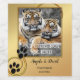 Wedding wine label featuring two tigers on a gold stylized background with cute paw prints. Beautiful for an African or Asian inspired celebration, a zoo or safari wedding or animal themed celebration.