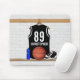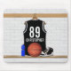 Customizable black and white basketball jersey hanging in a sports locker room with a basketball, basketball sneakers and a water bottle. The sports jersey is fully customizable with your own number and name to create a truly unique personalized sports gift for the basketball player or basketball fan.