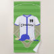 Cute baseball themed design. Featuring on the front a blue and white striped baseball jersey which can be customized with a name and number, a blue baseball cap, baseball and baseball bat. The background features a baseball field.