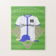 Cute baseball themed design. Featuring on the front a blue and white striped baseball jersey which can be customized with a name and number, a blue baseball cap, baseball and baseball bat. The background features a baseball field.