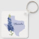 Texas, bluebonnets and a little southern charm. State of Texas in soft purple with a single bluebonnet stalk and your name in dark blue text. Pale hand drawn chevron pattern in the background. Matching products available.