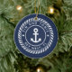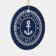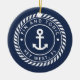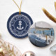 Create a unique boat keepsake with this custom photo ornament featuring your boat name and ship's registry in white lettering on a nautical rope badge with an anchor illustration in the center, on a navy blue background. Add a photo of your boat to the reverse side.