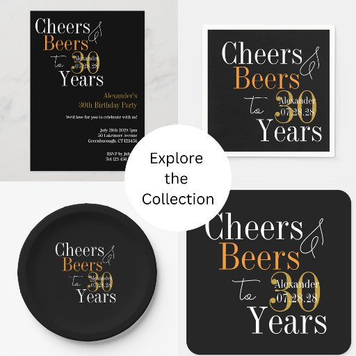 Celebrate your 30th birthday milestone in style with this “Cheers & Beers to 30 Years” design, featuring a black and gold design with pops of orange colored typography for a modern party look. Perfect for 30th birthday celebrations, with a fun cheers and beer theme. Personalizable details allow easy customization for the guest of honor’s name and date. A great addition to your birthday party décor, party favors, or event accessories.