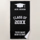 Personalized class of beach towels for graduation. Custom beachtowel with high school name and graduate year; 2024 etc. Cool graduation party gift idea for grads, students, seniors, etc. Fun summer accessories for beach or pool. Black and white or custom background color. Tassel hat and big letter typography template.