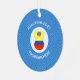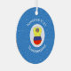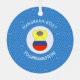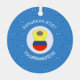Hanukkah decor metal ornament has an Abuela angel wearing the yellow, red, and blue flag of Colombia. The Colombian Hanukkah Abuela angel has gray hair and flies inside a circle of white squiggly squares. A background of blue squiggly squares surrounds it all. You can add your own text. You can personalize with a name or customize with the year