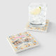 The coasters are gorgeous, a quality feel and heavy weight. They look like a precious archeological find. A rustic stone juxtaposed with a modern floral black and white print. I like the way the print goes slightly imperfect on the cut stone edges giving them a kind-of natural beauty.