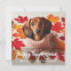 Cute Wiener Dog thanksgiving card featuring a cute dachshund in a knitted sweater surrounded by autumn leaves