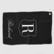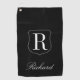 Personalized elegant name monogram logo black golf towel. Monogrammed golfing gifts for men and women. Stylish script typography template for name and initial letter. Luxury Birthday gift ideas for golfer, husband, dad, father, friend, co worker, boss, colleague, coach, instructor, trainer, teacher, grandpa, retired person etc. Add your own surname or funny quote. Including hook to hang it up. Unique golf accessories for friends and family. Classy shield emblem design. Customizable colors.
