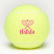 Personalized tennis balls printed with custom name and modern pretty script font and 2 simple tennis racquet.