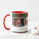 Personalised Family 3 Photo Collage Tartan Plaid Pattern Christmas Mug. Merry Christmas and a custom text. Add three photos. Personalise the text any way you wish or delete it. The background features a red and green plaid pattern. Great as a Christmas gift or a keepsake mug for the family.