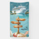 A fun tropical cruise scene featuring a large ship, sandy beach, playful wooden port signs, and a space to personalize your family name, ship name, port stops, and sailing dates—perfect for cruise lovers. This cruise door banner makes a great souvenir to remember your special trip.