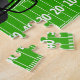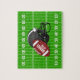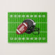 This custom jigsaw puzzle features a green football field along with a helmet and a football. In the center, there is a customizable field for adding the person's name. This makes a great gift for football fans.