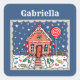 A colorful illustration of a festive gingerbread house. The outside of the house is decorated with two candy canes and has a large lollipop tree in the garden. The ground is covered in bright white icing sugar snow and strewn with sweets.