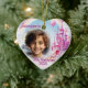 Beautiful personalized ceramic heart ornament decoration family photo keepsake of little girls birthday to hang on the wall and on the tree every year. Personalize it with a photo of your child and her name, keep a record of her as she grows up to hang on the tree. Pink 2 sided print