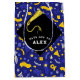 Creative graduation gift bag or party favor bags featuring classic grad cap design, congrats and blue and gold confetti. To personalize edit text to add his or her name.