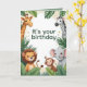Celebrate with this fun jungle animals birthday card! Featuring a cute lion, giraffe, zebra, monkey, and elephant surrounded by tropical leaves. Perfect for kids and animal lovers. Personalize with your own name or message.