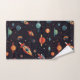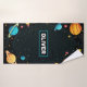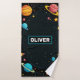 Fun bath towel set with a rocket ship and planets design, customizable with your name. Perfect for kids who love space!