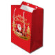 Elegant red and gold Christmas gift bag that can be personalized with a name on the festive ribbon banner! Features a classic holiday illustration of Santa Claus and his reindeer, surrounded by golden Christmas trees. Perfect for wrapping a special gift for friends, family, or as a unique party favor bag.