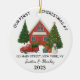 A charming personalized keepsake ornament to celebrate the first Christmas in a new house. Features a cozy watercolor house, red truck, and custom names/year. Perfect housewarming gift for a couple or family.