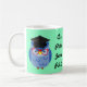 This cute PhD graduation mug features a blue owl wearing a mortar board (graduation hat) and glasses. It bears the graduate's title and qualification and can be personalized with any name. The background color and the font style can also be customized.