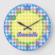 Personalized Pastel Checkered Kids Clock w/numbers Blue, pink, green, and yellow checkered pattern make the base of the clock. Numbers, bordered for easy visualization, are finished in coordinating colors.
