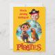 A perfect match for birthday fun! This cheerful design features your child as a cartoon pirate, standing on a beach with palm trees, a parrot, and treasure in sight. Insert your own photo and text.
