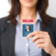 A professional employee staff badge for your business organization. Modern red, white and blue design. Add employees photo, name, id number and other important information. Information can also be added to the back. Official looking badge to help your staff stand out and be identified where needed.