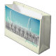 Large retirement gift bag with beach huts in gray, blue and yellow.