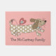 A pattern of cute little sausage dogs happily running along with a heart balloon tied to their tails.