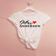 The personalized Mrs. shirt design with a modern, elegant script and red heart accent can be personalized with the bride's last name. Makes a great wedding gift for the honeymoon!