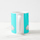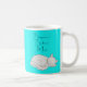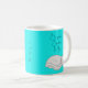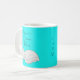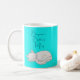 Personalized Sleeping Cat Bedtime Mug on turquoise background featuring original design by artist and illustrator Sandra Moore. Ideal gift for anyone who loves cats and a special bedtime mug! Information about the work of Sandra Moore can be found at www.sandramoore.co.uk