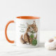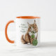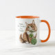 Celebrate the luck of the Irish with this adorable personalized cat mug, featuring a majestic long-haired orange tabby (or Maine Coon) ready for St. Paddy’s Day! This design showcases a fluffy feline friend wearing a green shamrock collar and playing with a ball of green yarn, perfectly complemented by a vibrant orange handle and interior (additional sizes and rim and handle colors available).