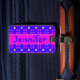 a vibrant luggage tag with a bold polka dot pattern in blue and pink, with prominent yellow dots. In the center, there is a hot pink stripe featuring the name "Jennifer" in a clear, bold font. The luggage tag is attached to a black strap with a classic buckle, suggesting it's ready to be used for travel.