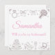 A chic and elegant way to ask your closest friends. This personalized bridesmaid proposal card features sweet dusty rose line art of wedding essentials like a ring, flowers, and cake. Simple, modern, and customizable with any name.