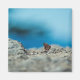 A photograph of a rare red and white, Pacific Northwest butterfly, the Taylor's checkerspot. The butterfly had landed on a rocky hill top, that drops off into the blue sky.