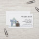Business card for pet kennels, boarders or pet adoption facilities Design features dog house and dog sitting on suitcases. Blue paw print bottom border.